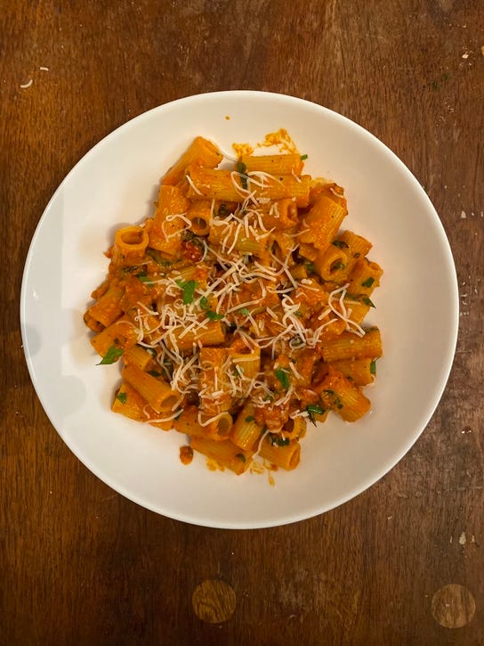 The shelter-in-place means I’ve gotten the chance to exercise my cooking muscles again. This week, my favorite meal was a simple rigatoni in vodka sauce with parmesan reggiano on top. Send me your favorite meals you’re cooking these days!