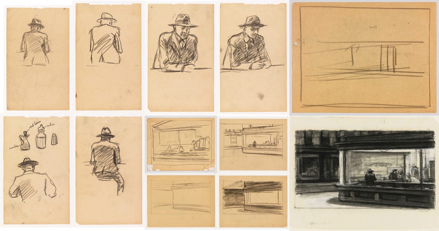 So I was giddy with excitement to find the original storyboards that the painting was based upon. Itâs a glimpse into the creation of a masterwork. You can see Hopper painstakingly consider every single element of his piece and how they fit together. There is something magical about them â as if we are looking over his shoulders as he considers and re-considers everything.