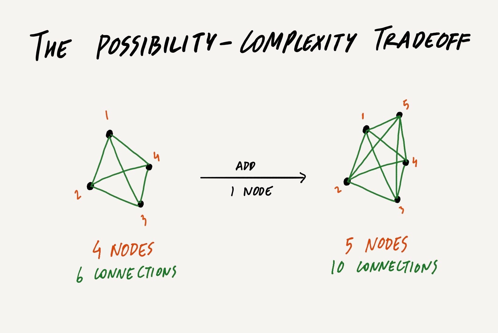 For example, think about a network of employees in your organization. If there are 4 employees, there are 6 potential collaborations of 2 employees. If we increase the number of employees by 1 to 5 (a 25% increase), the number of potential collaborations goes by 4 to 10 (a 67% increase). There is a disproportionate increase in the number of potential collaborations that you have to coordinate.