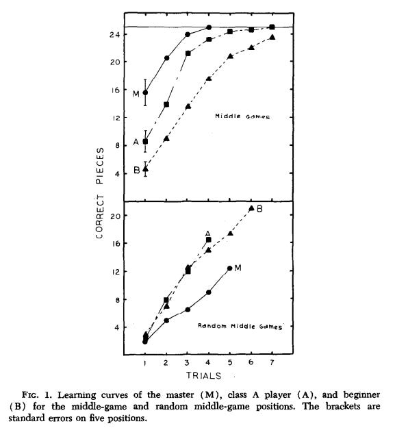 This figure showing the number of positions players were able to reconstruct after exposure for only a few seconds. Masters performed markedly better.